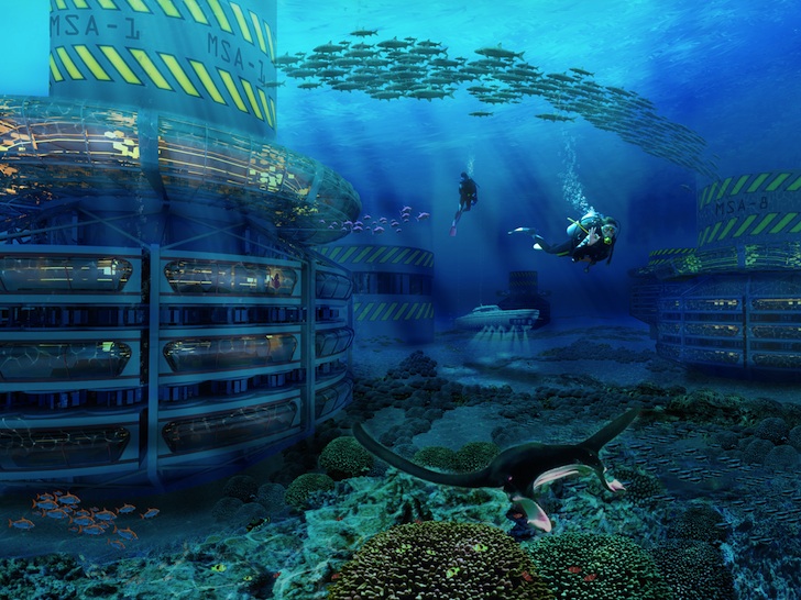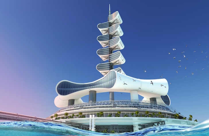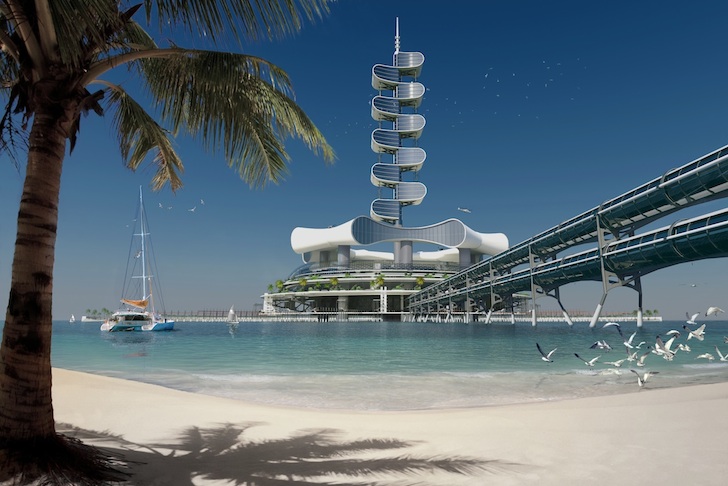 The entire surface of the offshore platform will be covered in solar panels that will provide energy for both Grand Cancun and the main city’s national grid. Vertical wind turbines and underwater tidal wave energy collectors will produce even more clean energy. A rainwater collection system allows water to be collected and then reused, which combined with a mini desalination plant will make the complex completely self-sufficient.