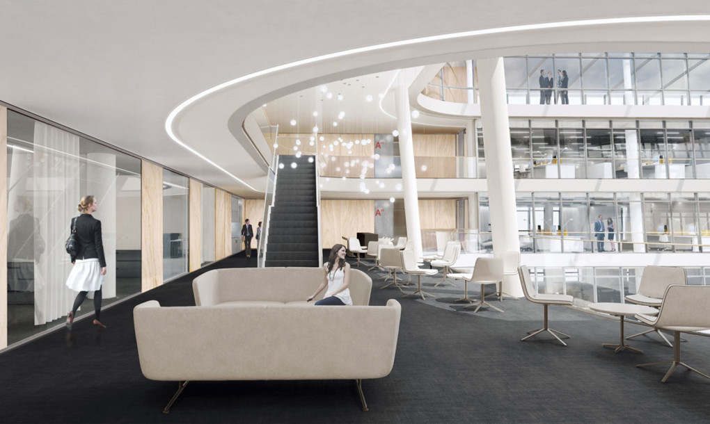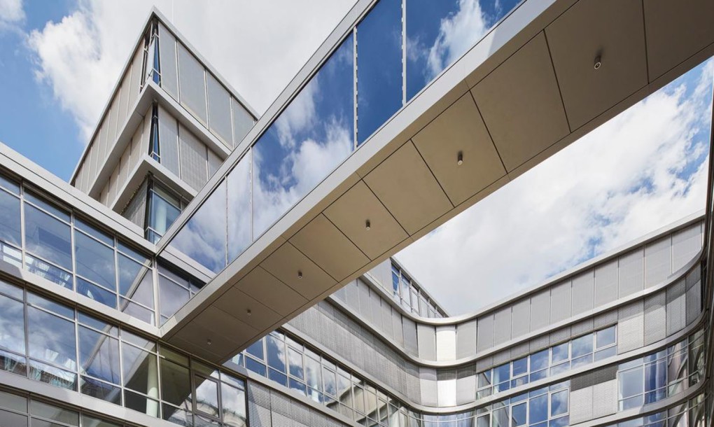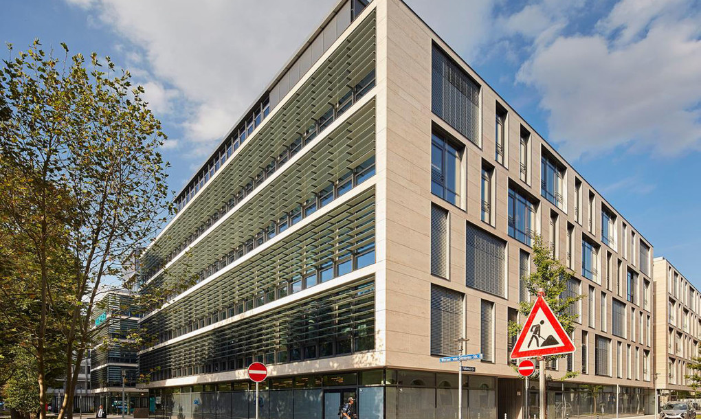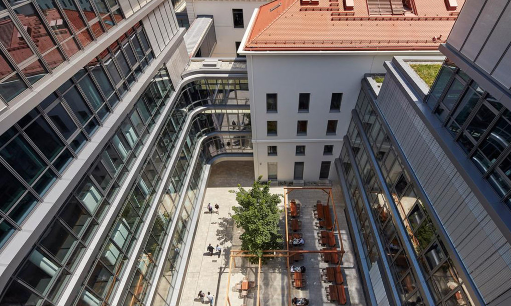 The building comprises a single volume with four rectangular courtyards and a publicly accessible ground floor that provides a new pedestrian connection between downtown Munich and the museum district. Floor-to-ceiling windows and a smart spatial organization allow employees to have visual connection to their colleagues throughout the building, while various open areas act as meeting spaces where people can collaborate across departments.