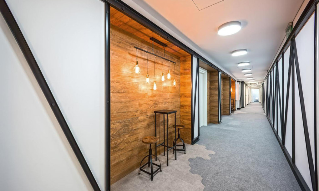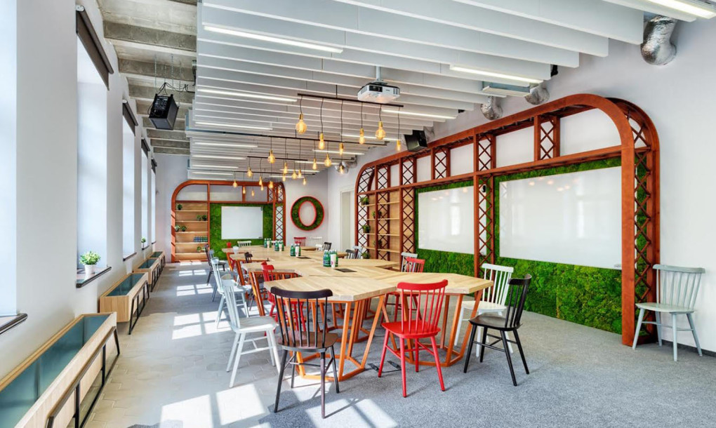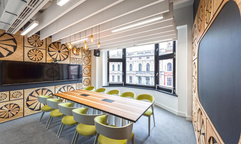The construction of Market Hall, Central Railway Station hall and Szczytnicki’s Park are referenced in the kitchenette, while the design of the meeting rooms is associated with IT and computers. The latter space features an integrated circuit, fans and decor made out of nearly 1,000 old floppy disks and over 200 keyboards.