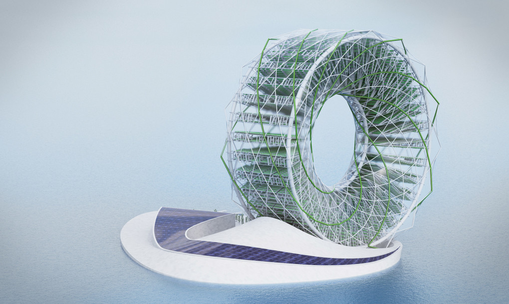 A desalination plant, rotating aeroponics farm, and algae bioreactor in one, Ring Garden is designed to “harvest seawater, CO2, and the sun’s energy to create food, biomass, and fresh water,” according to Predonu’s design brief. The plant is powered by photovoltaic panels that produce 440 MWh each year. 100 percent of that energy is used to power the desalination process and rotate the garden.