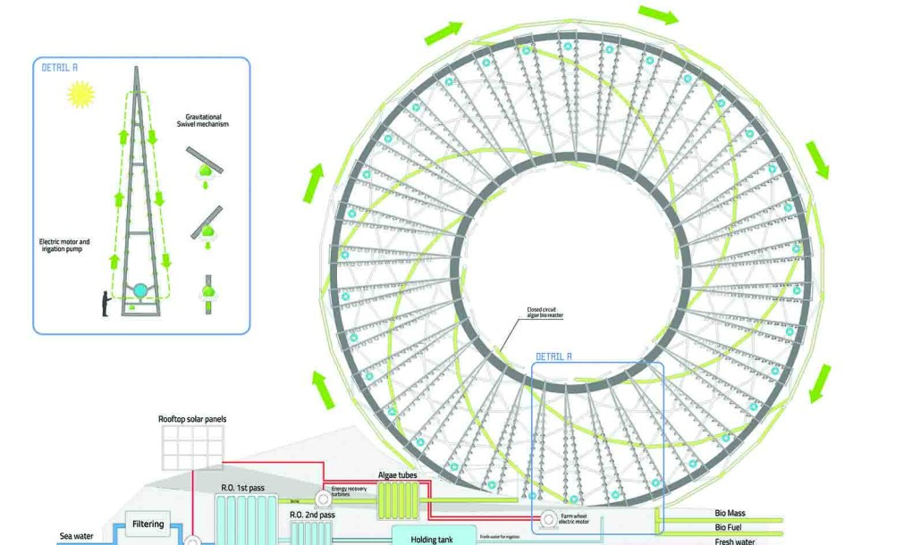 Clean water resulting from this process is then divvied up – 60 percent irrigates the rotating plants, 30 percent is sent to the city grid, while the remaining brine water, which would be potentially toxic to marine life, is fed through the bioreactor to cultivate spirulina for biomass.