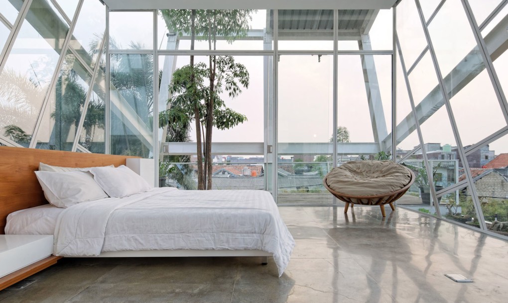 The slanted frame represents instability, while the glass-clad floors provide views of the neighborhood and the adjacent river. The glass box containing a study hovers over the long swimming pool on the mezzanine level. A master bedroom and bathroom sit on the first floor, while the top floor houses a lounge and guest suite.